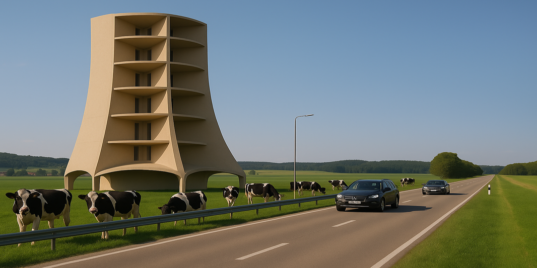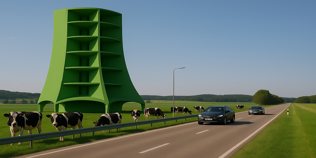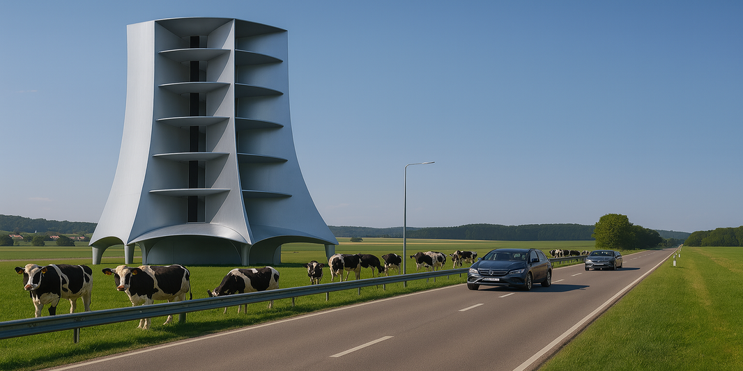 Inside the structure, vertical rotor blades rotate around a central axis — shielded from the environment and optimized for turbulent or multidirectional winds.